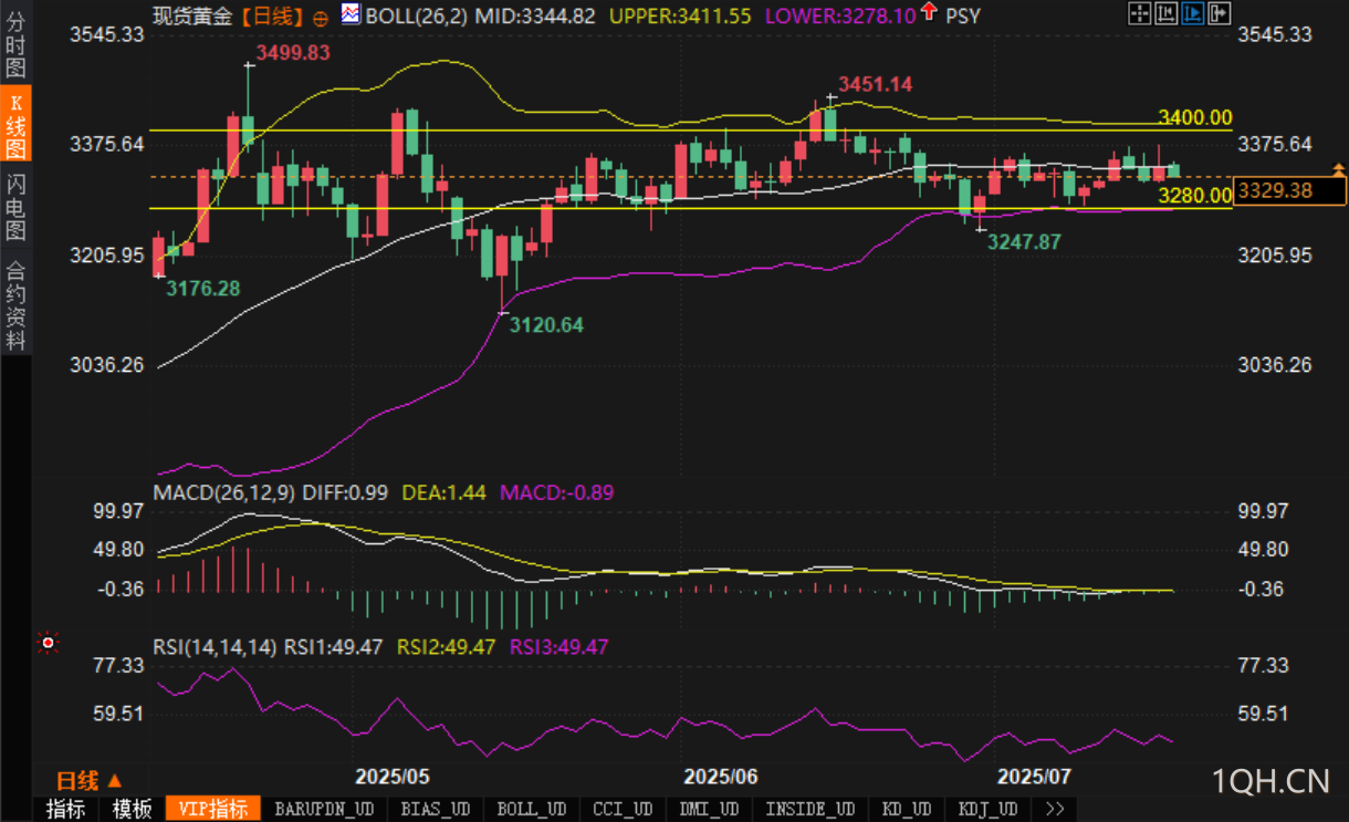 从K线图来看,现货黄金前期冲高至3499.83美元后快速回落,目前处于布林带中下轨区间运行,布林带呈收口状态,显示波动率正在收缩,行情进入整理阶段。当前价格在3329美元附近震荡,明显受制于布林中轨(3344.82)压制,而下方3278美元的布林下轨构成短期关键支撑。