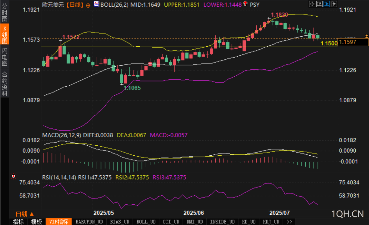 日线图显示,欧元/美元近期自1.1829高点展开连续调整,短期内形成明显的下降趋势通道。当前K线实体连续收于布林带中轨下方,布林通道整体走平略微向下倾斜,表明趋势动能逐步偏空。7月中旬以来的震荡下跌导致汇价逼近前期强支撑区域1.1500-1.1565,分析认为若失守1.1500整数关口,将打开进一步回撤空间,目标指向布林下轨1.1448附近。