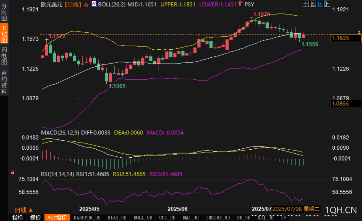从K线结构来看,日线图上EUR/USD短线止跌迹象初步显现,但整体仍运行在回调通道内。汇价在测试1.1556低点后,今日反弹至布林带中轨1.1651附近,若能有效突破该水平,将有望打开进一步修复空间。