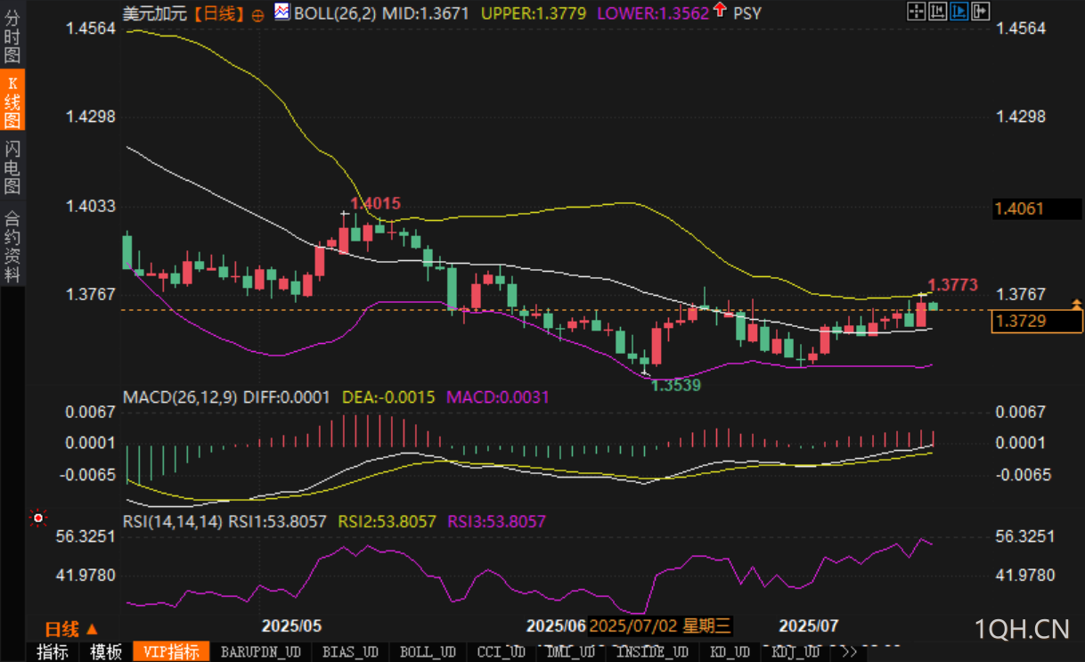 中长期来看分析认为,美元/加元仍处于震荡偏多结构,但需关注贸易谈判进展及美联储政策预期变化。若美元指数维持强势,且市场对美联储降息预期进一步降低,美元/加元有望挑战高点1.4061;