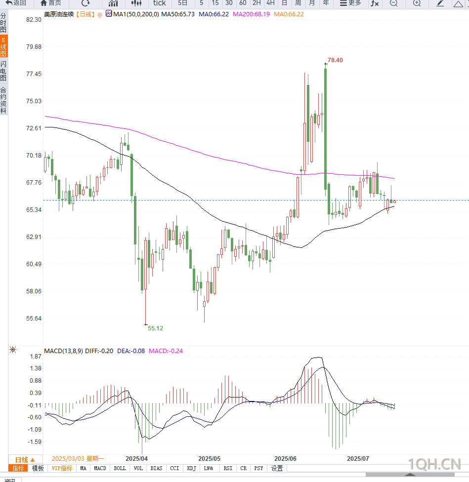相反,若跌破65.30美元支撑,可能下探64.00美元区域。整体来看,WTI正处于整理阶段,需等待宏观消息或供需面催化形成突破方向。