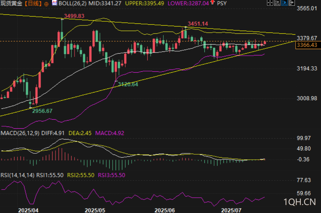 分析认为价格短期支撑位关注3287附近(布林下轨、上升趋势线),若失守,或测试3194、3120一线;上方阻力关注3395(布林上轨)、3451(前高);突破三角形任一边界,预示趋势可能进入新阶段。