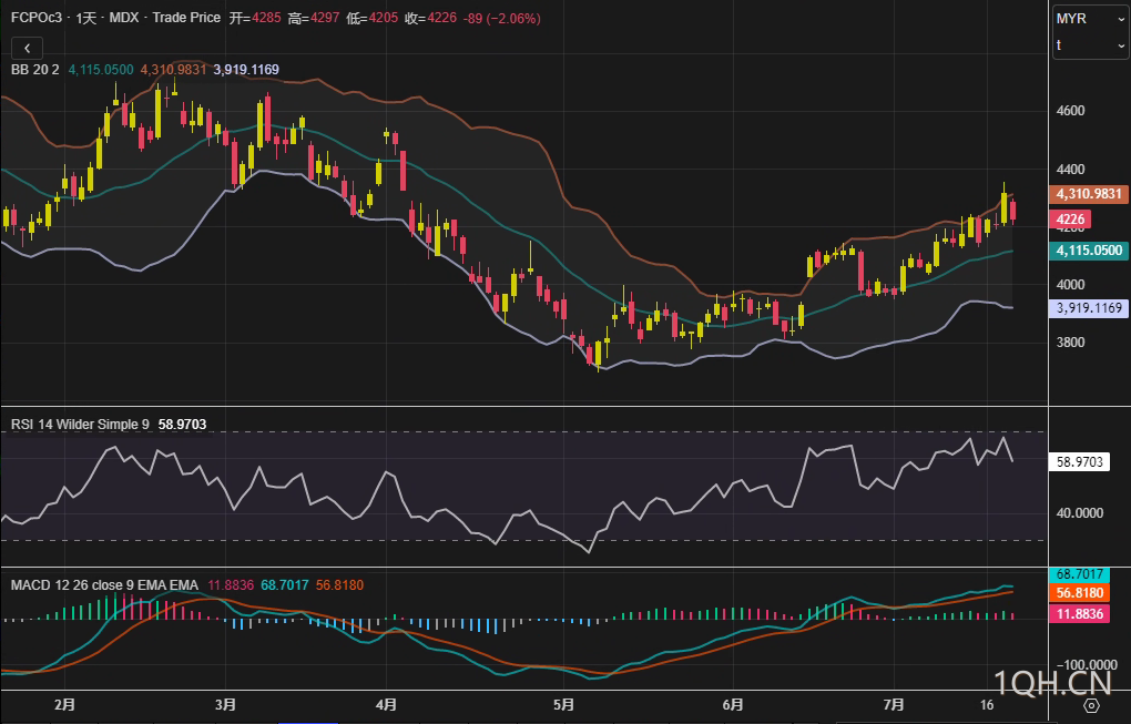部分分析师对后市持谨慎态度。新加坡某知名机构农产品研究主管认为:“若出口未能改善,库存重建可能加速,8月合约或下探4000林吉特心理关口。”该观点与技术面形成呼应——当前价格已逼近布林通道下轨3919林吉特,若突破则可能打开下行空间。