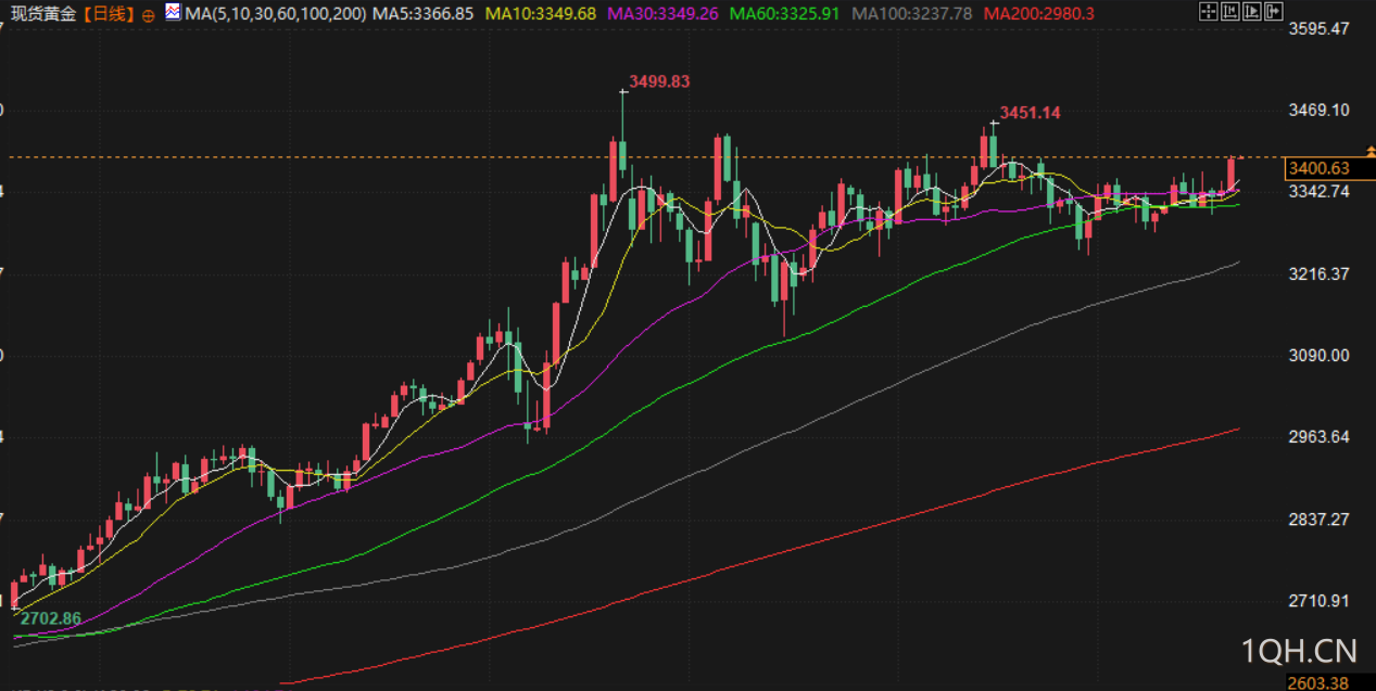 现货金报每盎司3394.23美元,上涨1.3%,创6月17日以来新高。美国期金收高1.4%,报3406.40美元。美元指数下跌0.6%,使得以美元计价的黄金对于使用其他货币的买家来说更加实惠,而指标10年期美国公债收益率创下逾一周新低。