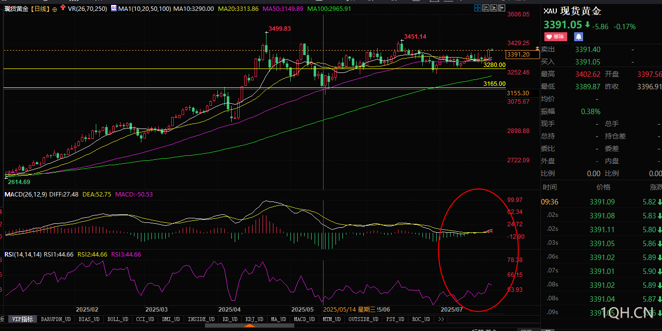 周一现货黄金日内低开高走,盘中一度强势刺穿3400美元/盎司这一关键心理与技术阻力位,最高触及3401.41,但最终收盘至3396.91美元/盎司,未能站稳3400上方,伴随着市场热度激增,Macd的日线级别顶背离初现,黄金赛道交易依然拥挤,后市关注Macd 零轴以上的整理,以及箱体高位震荡的稳定性等待Macd的修复。周二(7月22日)亚市早盘,现货黄金冲高回落。