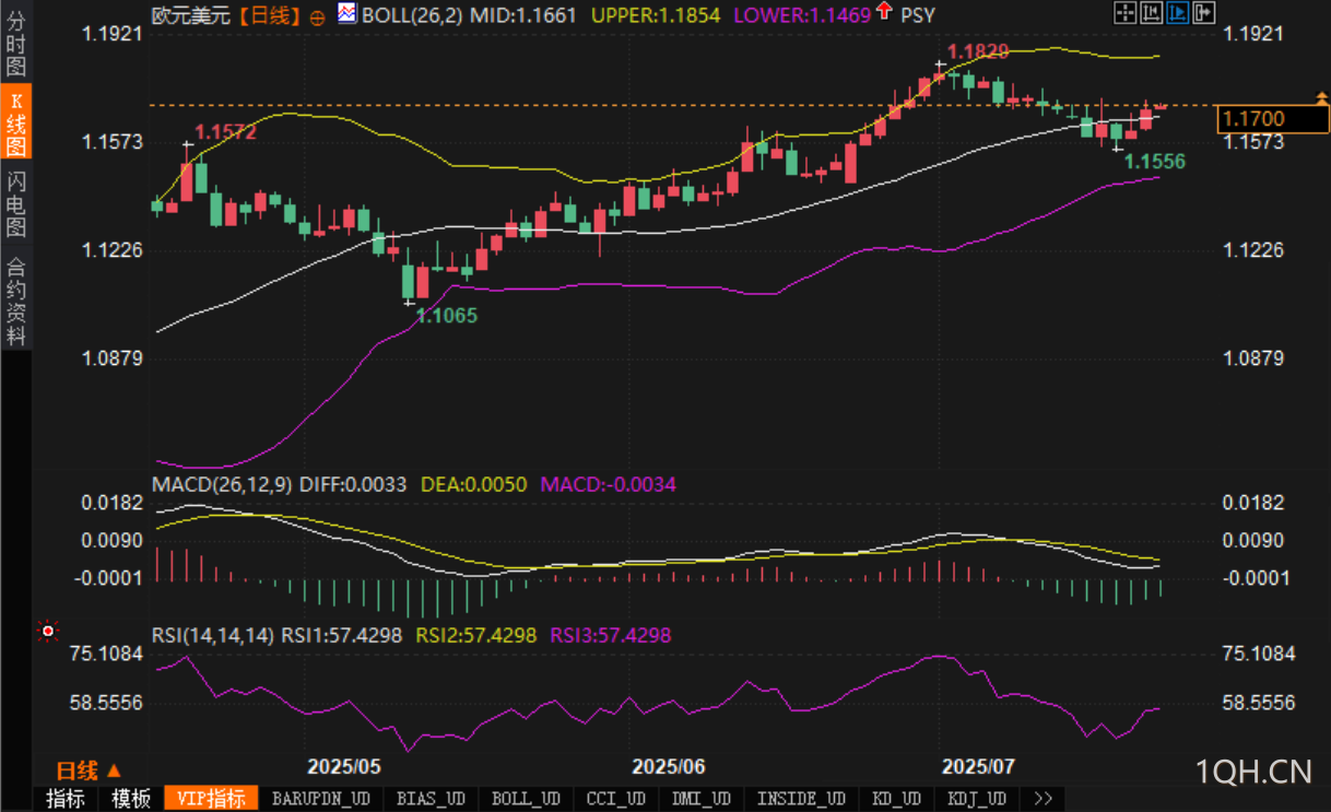 技术结构上,汇价已突破此前自7月初以来构建的下降通道上轨,形成潜在“假跌破”后的反转结构,具备向上延伸的动能。分析认为上方阻力关注前高1.1829与布林带上轨1.1854,若突破则有望挑战1.1900心理关口;下方支撑则依次落在1.1675、1.1556(前低)及布林带下轨1.1469。