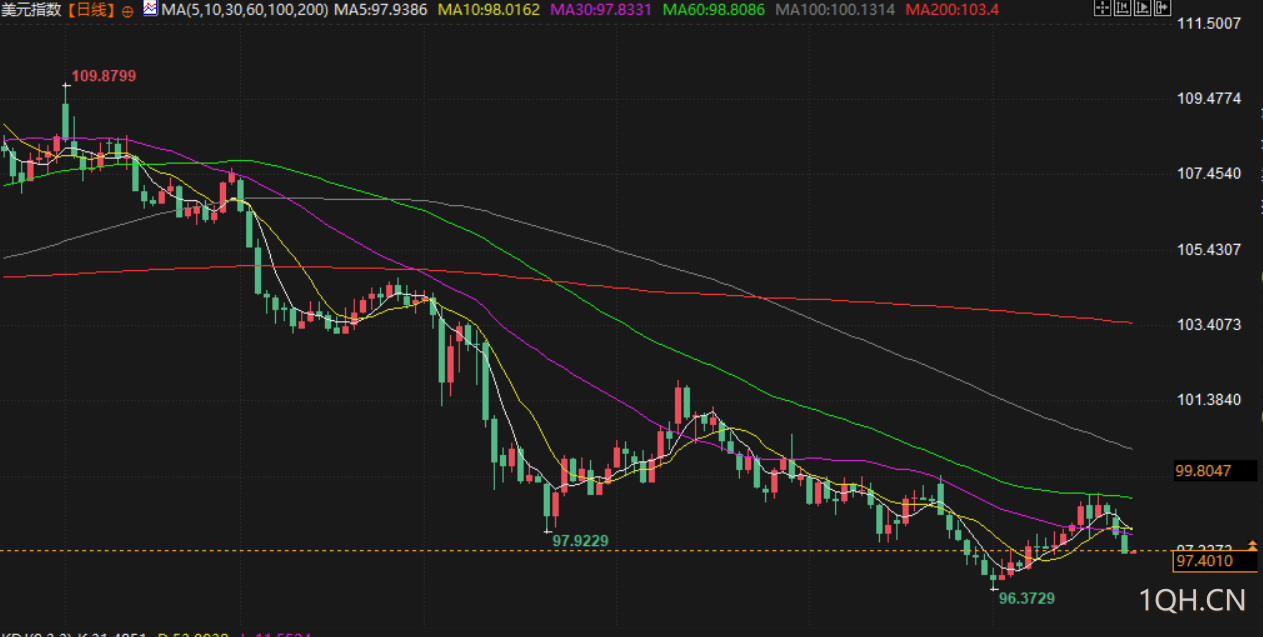 衡量美元兑一篮子货币价值的美元指数下滑 0.3%,至97.545 ,周一下跌约 0.6%。该指数在盘初触及两周低点。