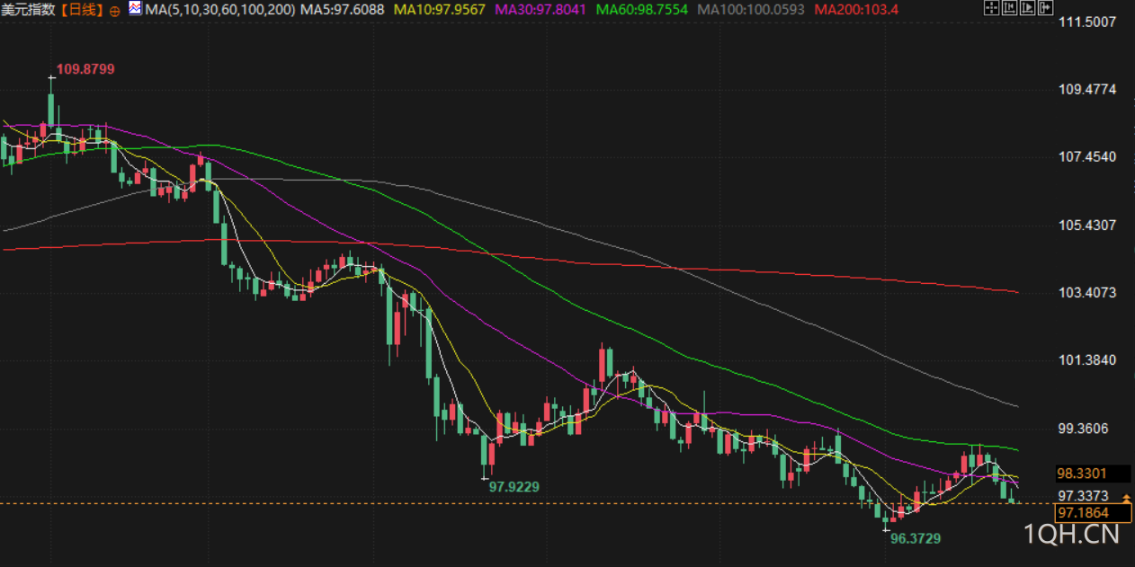 衡量美元兑日元和欧元等一篮子货币的美元指数下跌0.14%至97.33,有望连续四个交易日下跌。英镑上涨0.26%,报1.35690美元,澳元触及八个月高点,尾盘上涨0.4%,报0.6584美元。