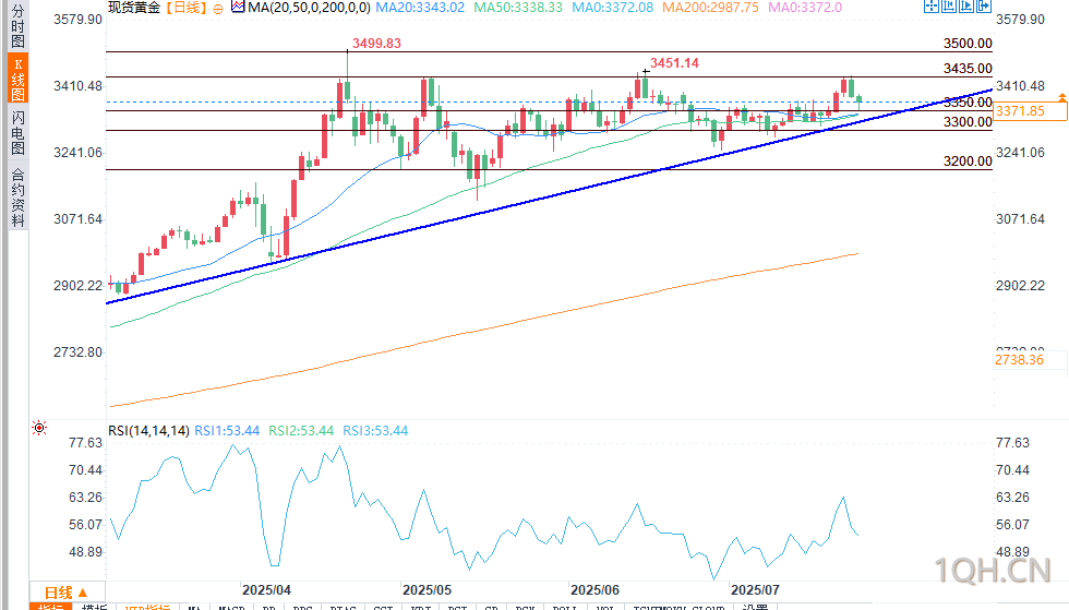 5月的次高3435美元此后在6月守住高点,截至7月目前仍是阻力。若多头能攻克这一水平,便有望再度挑战3500美元关口。
