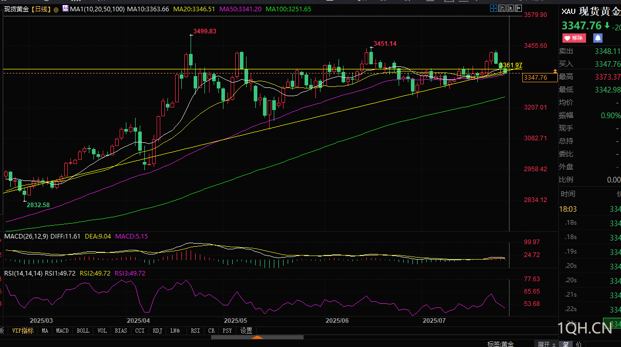 周四(7月25日)亚洲时段,现货黄金延续昨晚跌势继续下挫0.59%交投于3348美元/盎司附近。