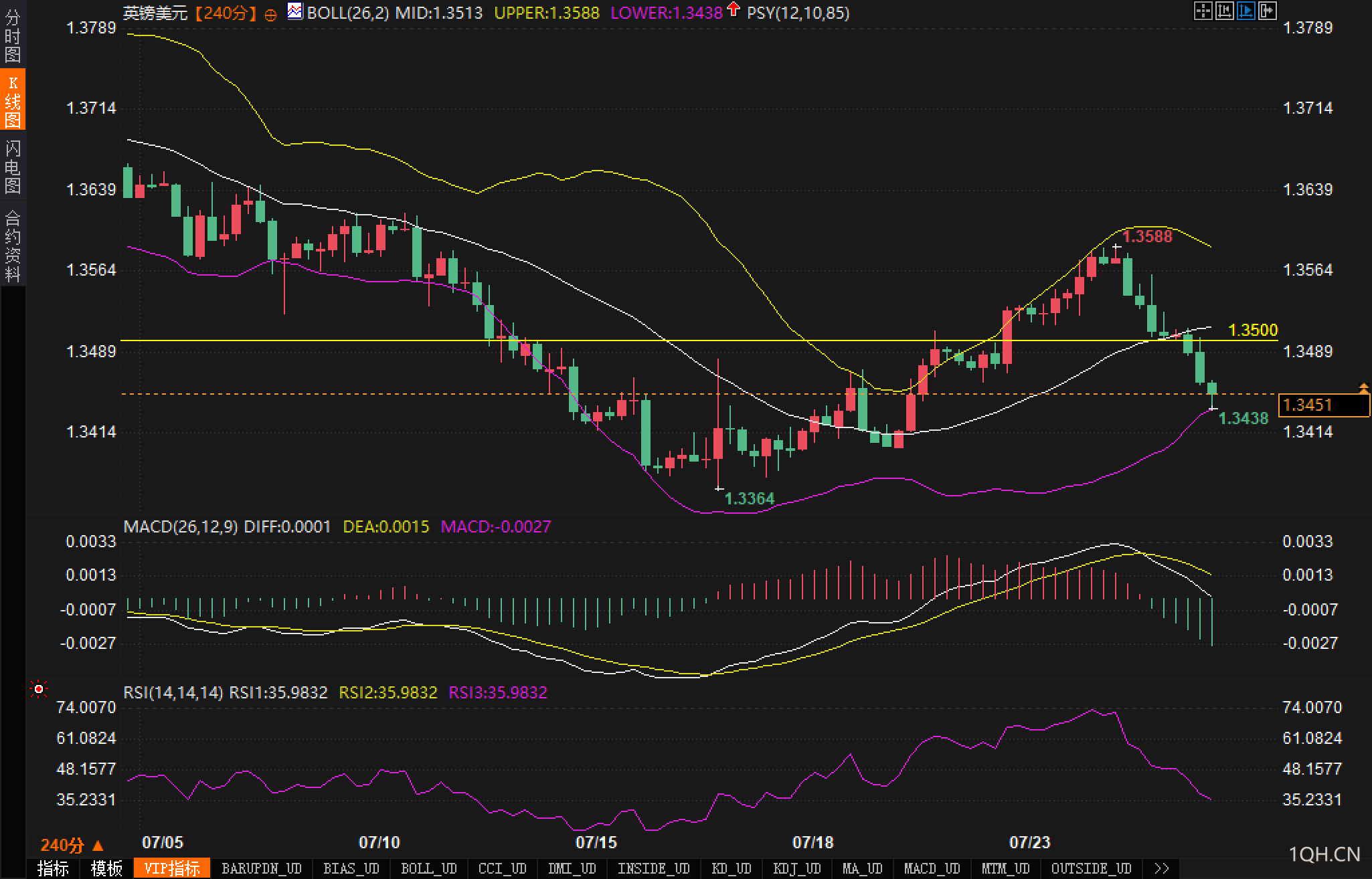 英国私营部门活动放缓进一步增加了英镑的下行压力。周四公布的7月英国标普全球采购经理人指数初值显示,综合PMI为51.0,低于预期的51.8和前值52.0,反映出全球形势不确定性和温和的招聘趋势对商业活动的影响。