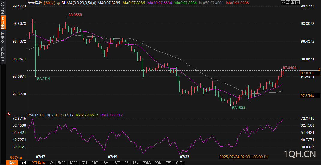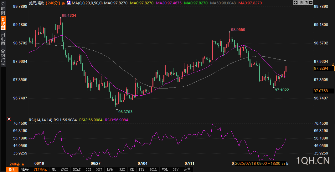关键价位:上方阻力聚焦97.84(前期密集成交区)与98.06(7月中旬高点),下方支撑需关注97.55(20周期均线)与97.40(本周低点)。若数据担忧情绪升温,价格可能快速下探97.55,测试金叉有效性;若情绪缓和,短期或维持97.60-97.90区间震荡。