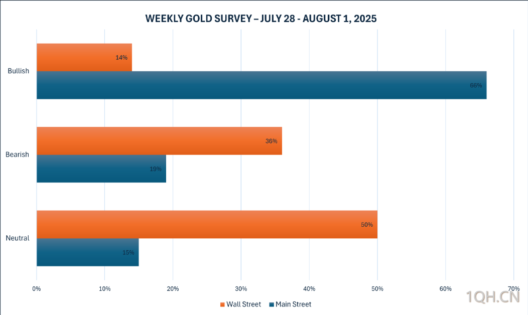 上周,14位分析师参与了Kitco新闻黄金调查,华尔街看涨者因黄金突破失败而稀缺。仅有两位专家(14%)预计本周金价会上涨,而五位(36%)预测价格下跌。其余七位分析师(50%)认为下周黄金价格将横盘。