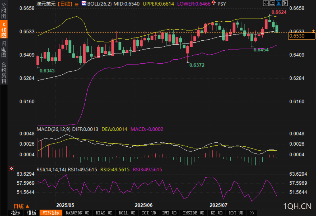 综上,从技术面角度判断,分析认为澳元兑美元当前正处于上行趋势中的回调阶段,若后续不能守住0.6540一线,则可能进一步测试下方0.6454~0.6466区间支撑;反之,若汇价重新站上0.6600,则趋势有望延续。