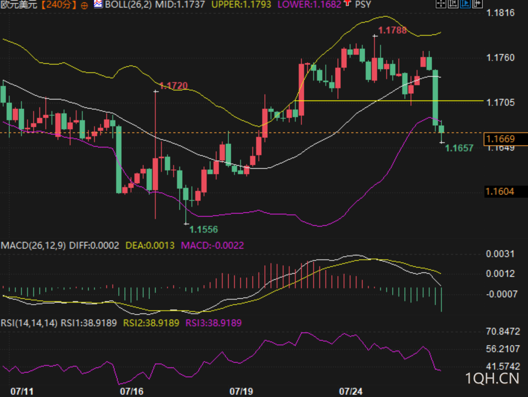 从4小时K线图来看,汇价在1.1788高点形成顶部形态后快速回撤,短线构成明显的“假突破”结构。近期价格最低下探至1.1657,靠近前低1.1556所构成的中期关键支撑区。
