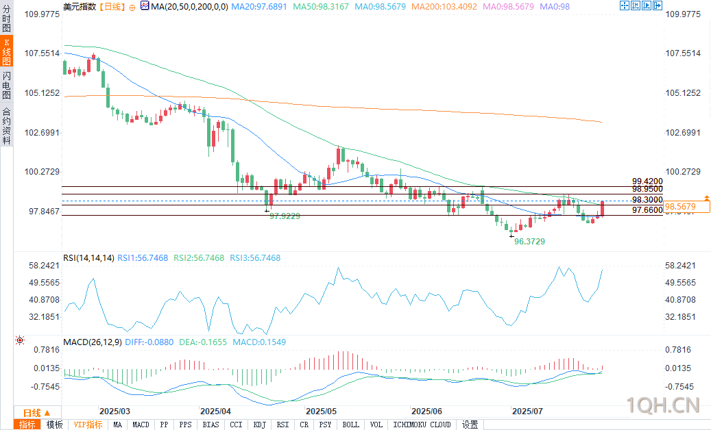 这一波上涨延续了美元自上周97.11低点的反弹势头,使得7月16日的高点98.95重新成为短期阻力位。美国近期与日本达成协议,以及与中国重启贸易谈判,也推动了美元走强,因市场对贸易中断风险的预期日益降低。