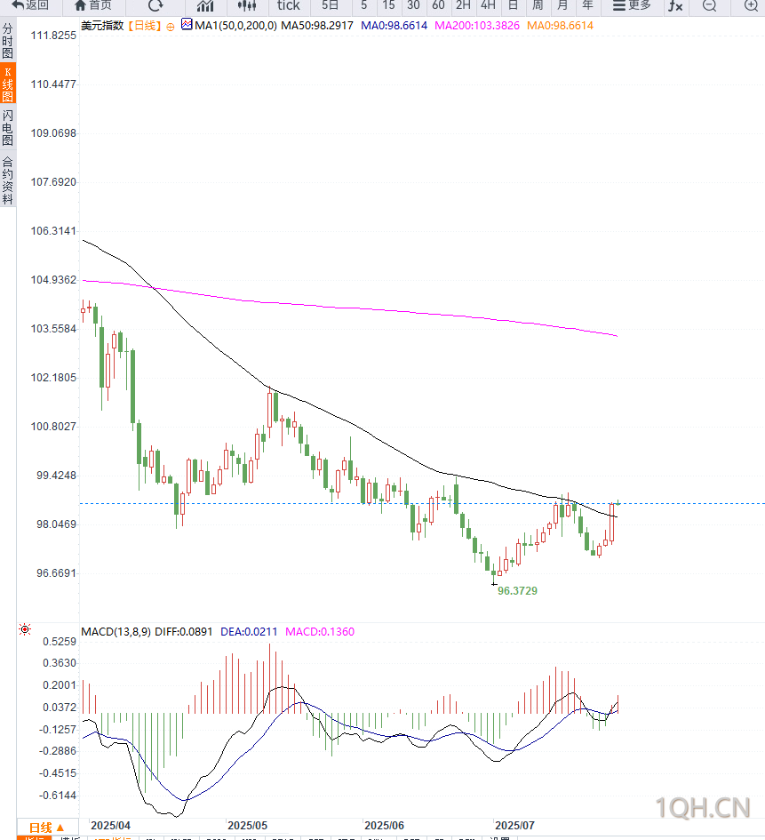 从日线图技术形态来看,美元指数(DXY)维持稳步上行通道。当前价格稳居于20日与50日均线上方,显示短中期多头趋势完好。MACD指标持续在零轴上方扩张,动能柱增强,表明买盘力量主导市场。