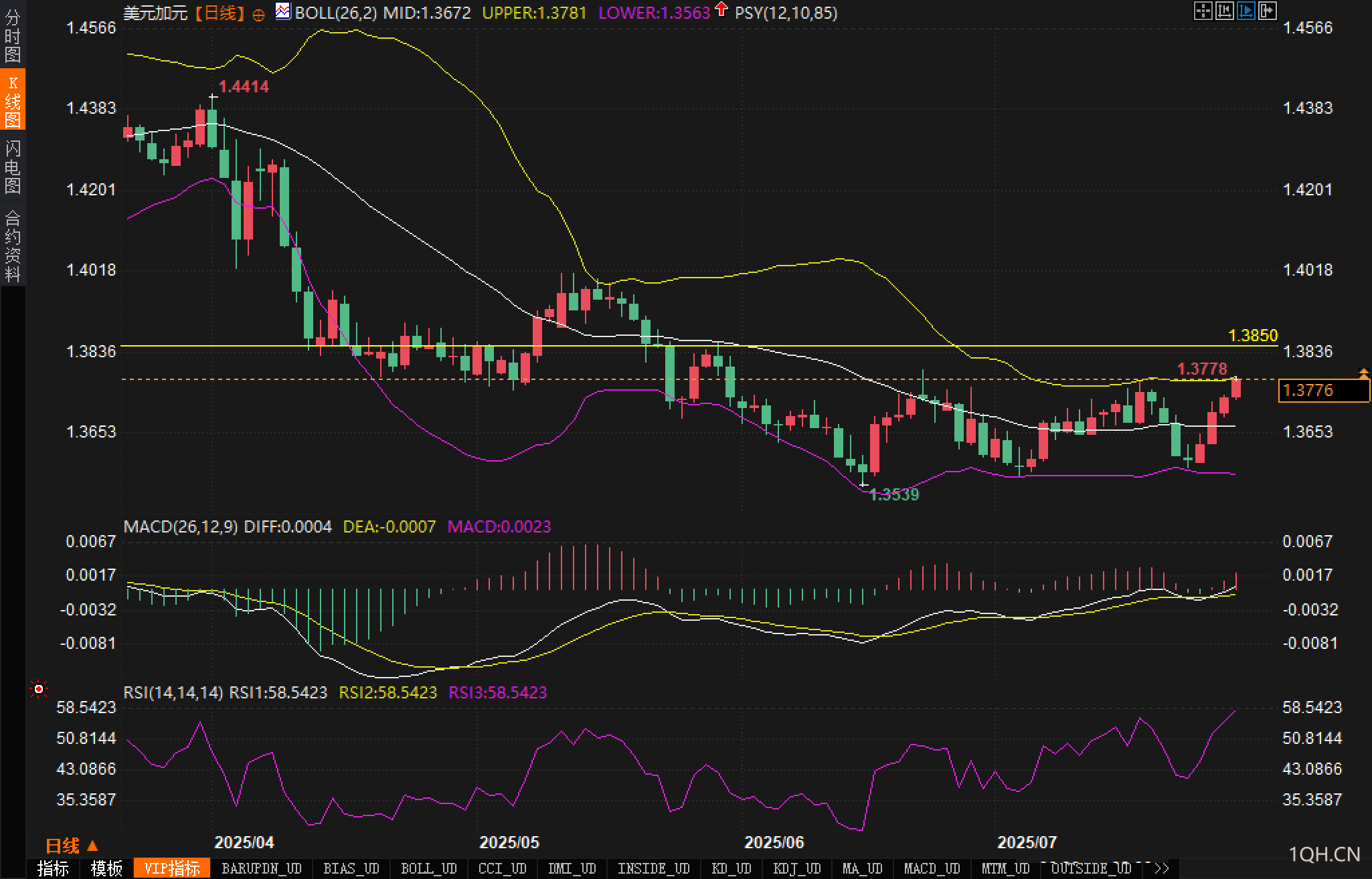 从日线图来看,美元兑加元在近期持续反弹,再度逼近关键阻力位。布林带显示,中轨位于1.3672,当前汇价运行在布林上轨附近,技术面动能偏多。布林带上轨1.3781已构成首要阻力位,若突破,则进一步上行目标将指向1.3850关口。