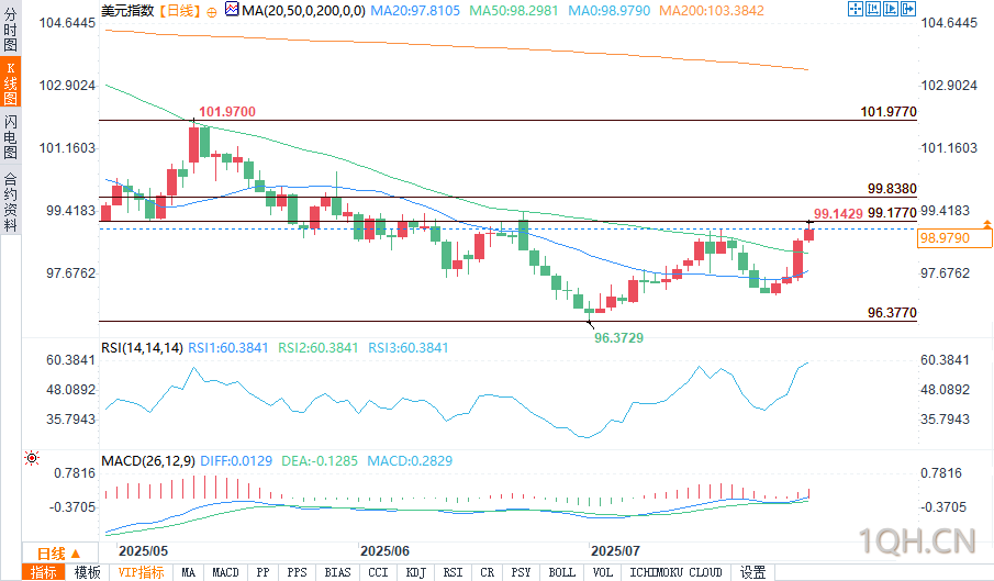 此次突破确认了短期趋势反转,目标指向99.177至99.838之间的关键回撤区间。随着美元指数攀升至98.950上方,6月23日高点99.421和5月29日峰值100.540现已成为潜在上行目标。