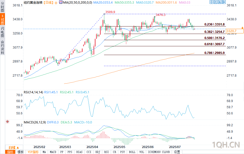 从技术层面来看,8月黄金期货多头在近期整体技术面仍占优势,但优势正逐渐减弱。多头的下一个上行目标是使收盘价突破7月高点3451.70美元这一关键阻力位。空头的下一个近期下行目标是将期货价格压至6月低点3250.50美元这一关键技术支撑位下方。第一阻力位见于本周高点3345.40美元,其次是上周五高点3376.60美元。第一支撑位见于本周低点3300.00美元,其次是3275.00美元。