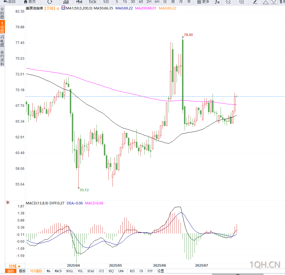 当前美原油(WTI)日线图显示,价格成功突破自6月以来的下降趋势线,并站稳在20日与50日均线上方,短期趋势已由弱转强。技术指标方面,MACD快慢线形成金叉,动能柱持续放大,RSI指标位于62附近但未进入超买区间,显示上涨动能仍具延续性。