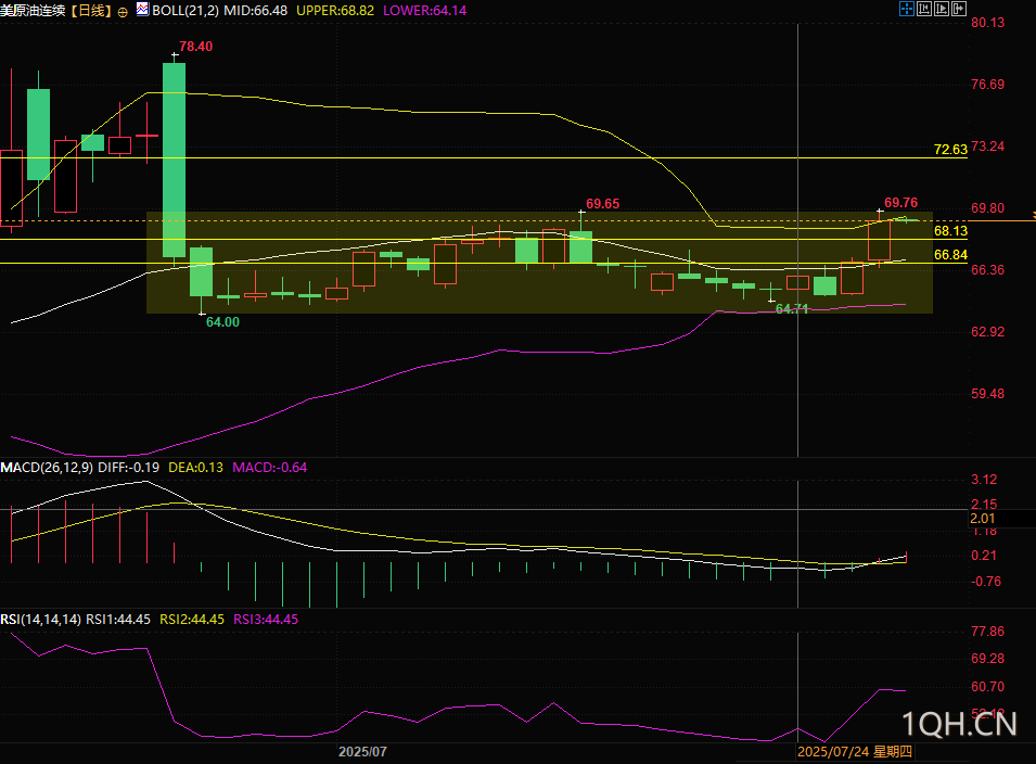 美油价格受箱体中轨和布林中轨支撑,并助推油价上涨至69.65油价箱体上沿以及0.618反弹分位,同时目前运行至布林带上轨道。由于受到箱体上沿和布林轨道上轨压制,这里等待MACD首次上穿零轴上方后回踩零轴的整理状况以及RSI在50附近的整固。后续观察如果能在箱体上半区分界线68.13以上整理,则有望对箱体上沿69.65进行突破,后续突破的下一目标价位是72.63。
