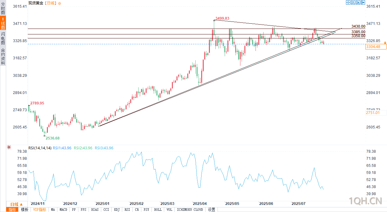 黄金成功守住了每盎司3300美元左右的关键支撑位。现货黄金最新报每盎司3305.60美元,当日下跌0.58%。
