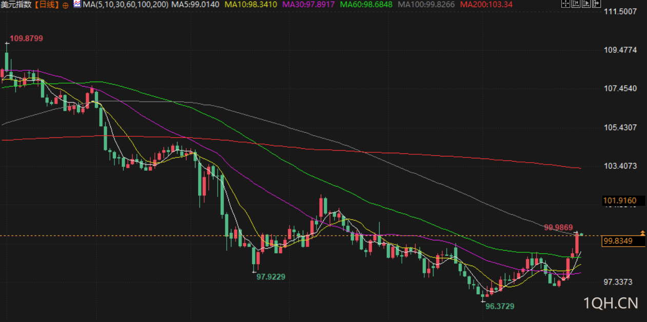 美联储会议后,美元指数涨幅扩大。该指数上涨 0.96%,报 99.82 点,创下 5 月 29 日以来的最高水平,并有望实现今年以来的首次月度上涨。