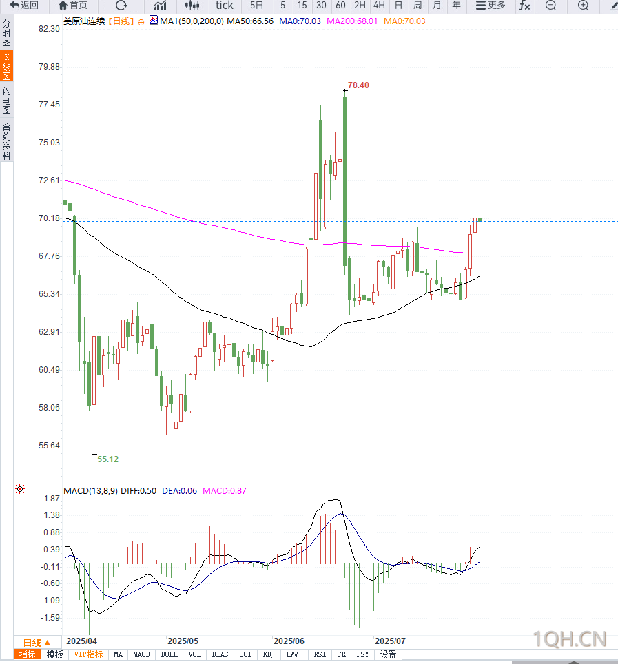 日线级别来看,WTI原油价格自66美元一线反弹后已连续四日收阳,当前稳定运行于70美元/桶整数关口上方,短期均线系统呈多头排列,MACD指标维持在零轴上方扩散,显示多头动能依旧强劲。