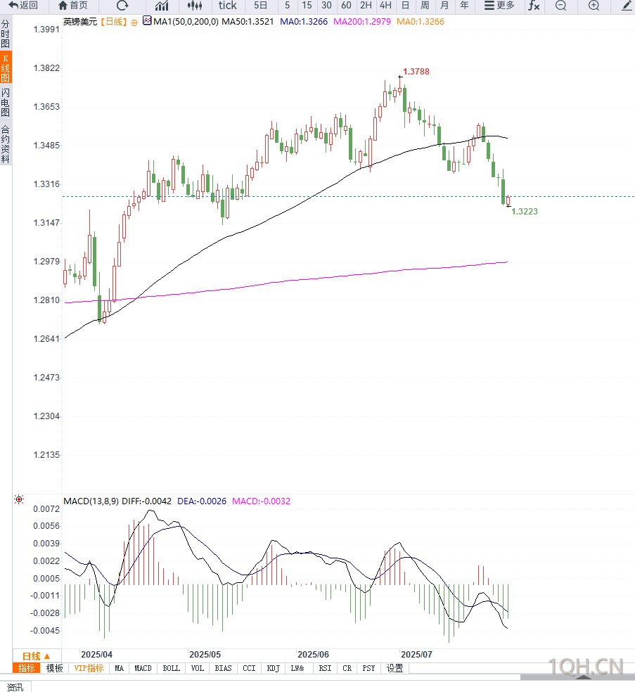 从技术面来看,GBP/USD已下破关键的100日均线(当前位于1.3275附近),这是自4月中旬以来的首次,成为空头的重要信号。当前短线反弹仍受限于1.3300整数关口与20日均线压制,上方若无法有效突破1.3320,将面临回落风险。
