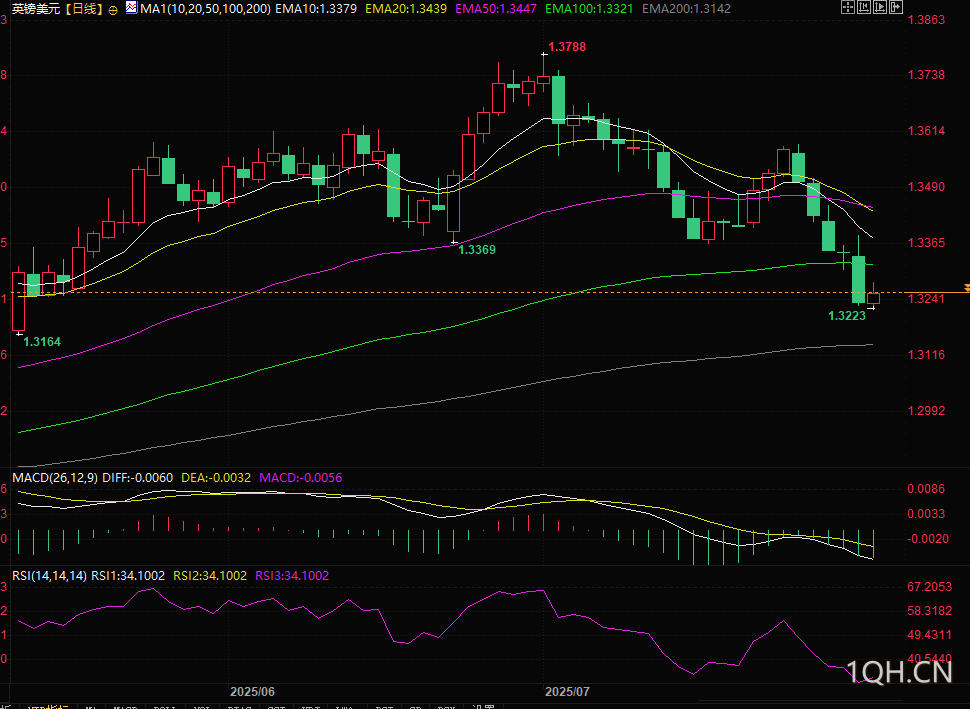 美元指数在周三FOMC会议后飙升至两个月高点,随后在两月内高点上方整理,对英镑/美元形成直接压制。美联储的鹰派立场限制了美元的回调空间。美联储主席杰罗姆·鲍威尔在会后新闻发布会上表示,对9月降息没有明确打算,强化了市场对美元强势的预期。此外,周三发布的美国宏观数据表现强劲:7月私人部门就业人数增加10.4万个,第二季度GDP年化增长3.0%,相较第一季度收缩0.5%改善显著。这些数据都支撑了美元的上涨,限制了英镑/美元的上攻潜力。同时,中美贸易休战延期的不确定性进一步支撑拥有避险属性的美元,减少其进贬值的可能性。