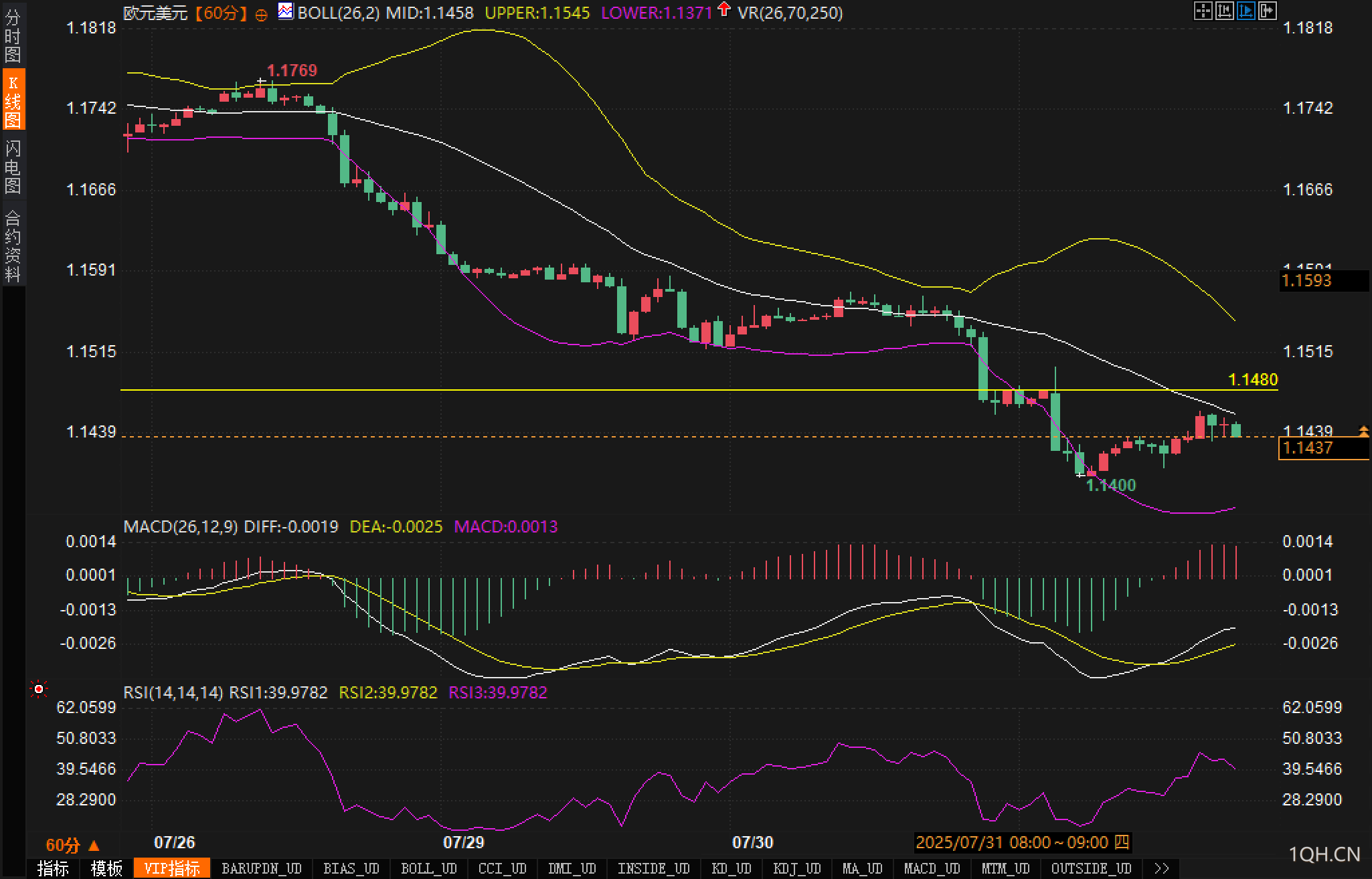 汇价在1.1480前期支撑位反弹乏力,当前受制于布林中轨压制,1.1480现转化为明显的阻力位。分析认为若后续无法站稳该位,或将再度测试1.1400的支撑区域。而一旦跌破1.1400,或打开向下测试1.1300区间的空间。