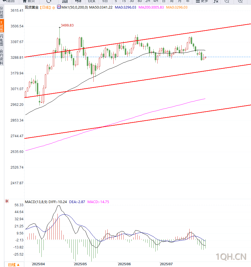 下方支撑方面,100日均线在3,270附近提供初步支撑。若跌破,可能引发更大下行压力,目标指向3240区域,即6月低点区域。若进一步下破,空头目标将对准心理关口3,200。