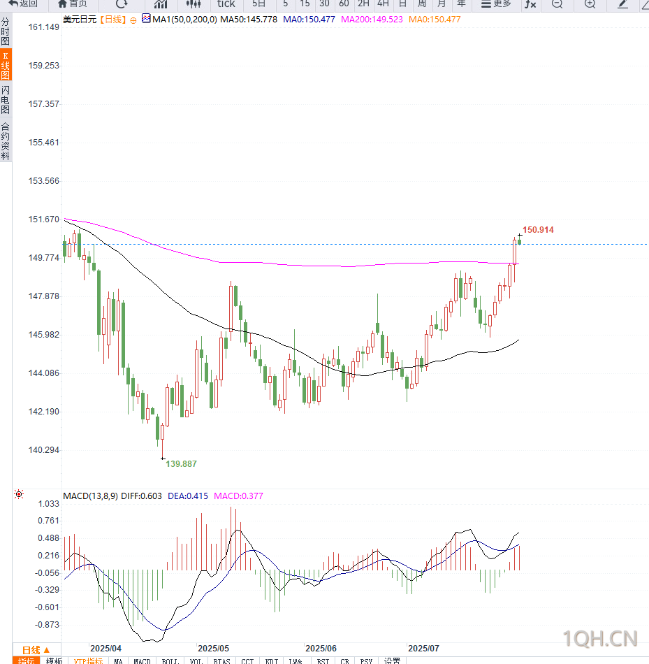 美国总统特朗普则在周四签署行政令,将对主要贸易伙伴实施高达41%的关税,施行日期提前至8月7日。这一贸易政策的不确定性虽然对部分避险资产构成支撑,但尚不足以扭转日元的弱势格局。