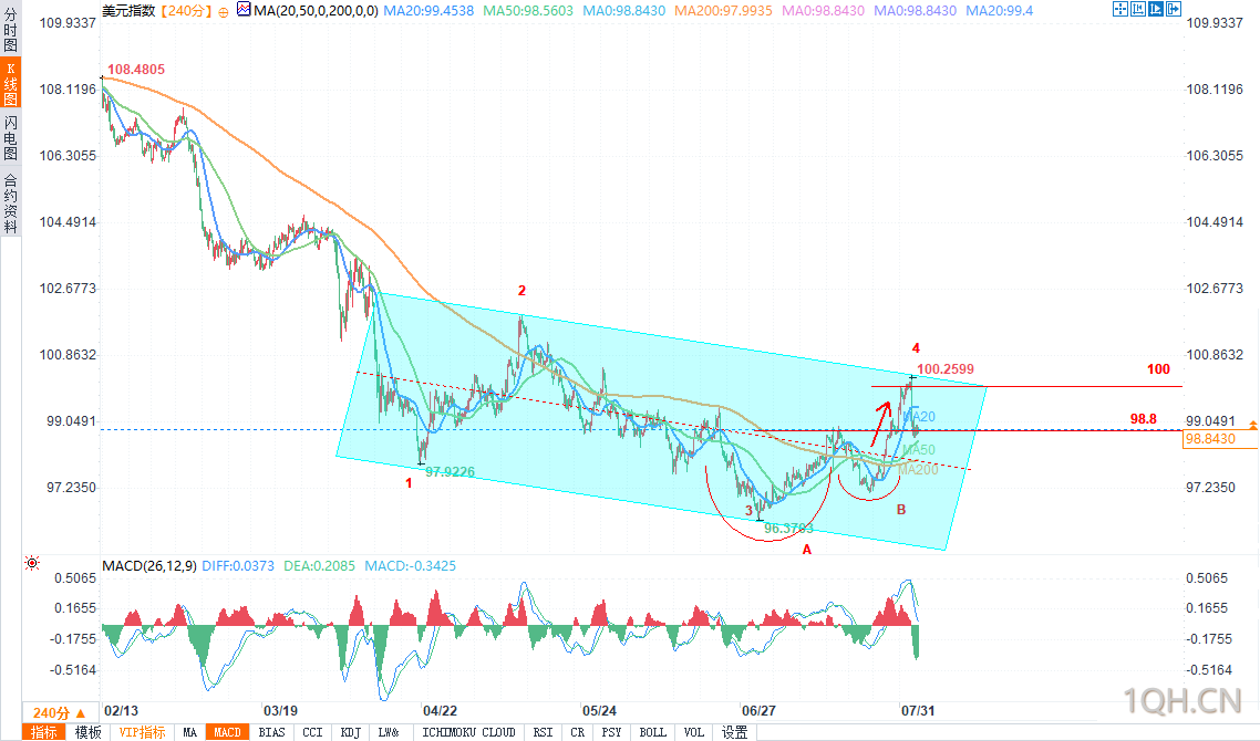 图表上形成了一个新的高点(4),同时出现了对100.00这一心理关口的假突破;