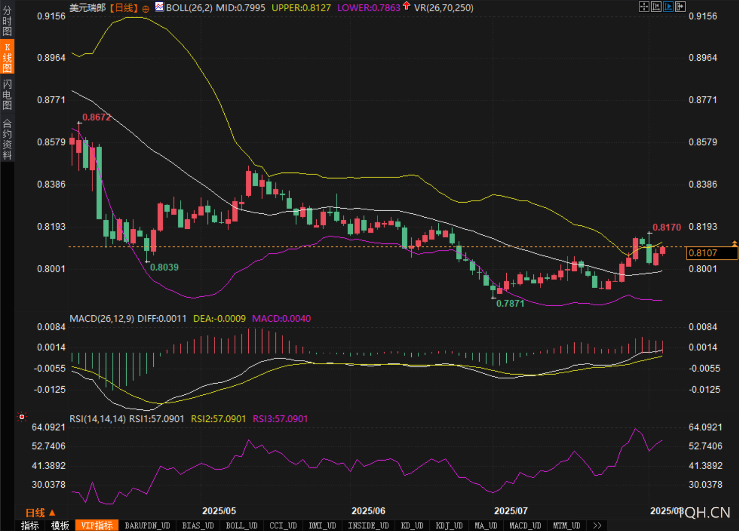 从日线级别K线图来看,美元兑瑞郎汇价在触及0.7871阶段低点后逐步回升。当前价格位于布林中轨上方,但未能有效突破上轨,预示短期仍面临一定阻力。