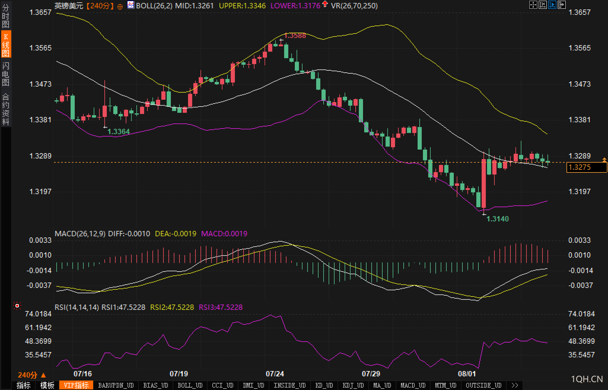 从4小时K线图观察,GBP/USD汇价自高点1.3588开启下行趋势,最低探至1.3140后企稳回升,短线进入横盘整理阶段。当前汇价运行于布林带中轨附近,布林带呈收敛态势,显示波动率收缩,后市或酝酿方向性突破。