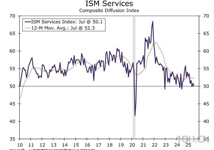7月ISM指数显示服务业仅维持“爬行式增长”,商业活动、新订单、就业三大核心分项均创阶段性新低。