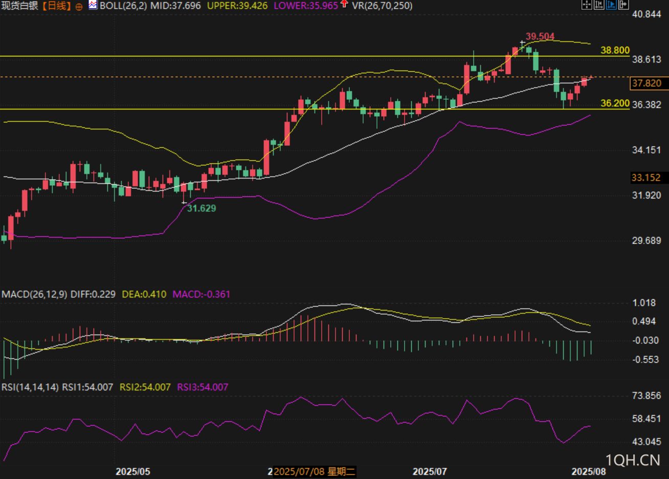 从日线图技术结构来看,当前白银处于短期回调后的整理阶段。布林带结构显示,中轨位于37.696美元,价格已回升至中轨上方,显示短线支撑逐步夯实。布林带上轨和下轨分别位于39.426与35.965美元,带宽开始收敛,反映当前波动率收缩,或为下一轮方向选择蓄势阶段。