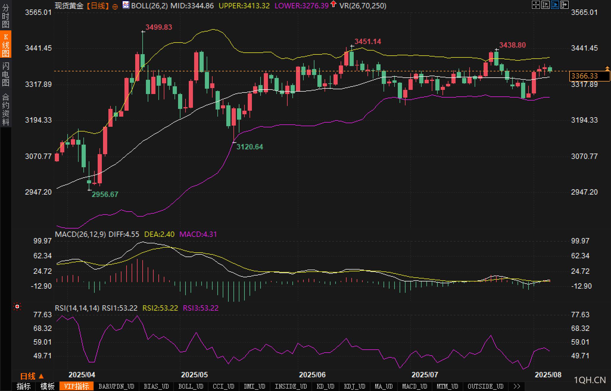 从日线图来看,金价目前运行于布林带中轨与上轨之间,略高于中轨水平3344.86美元,整体仍处于高位震荡区间。布林带带宽未显著收窄,表明市场波动率仍处于相对中性区间。