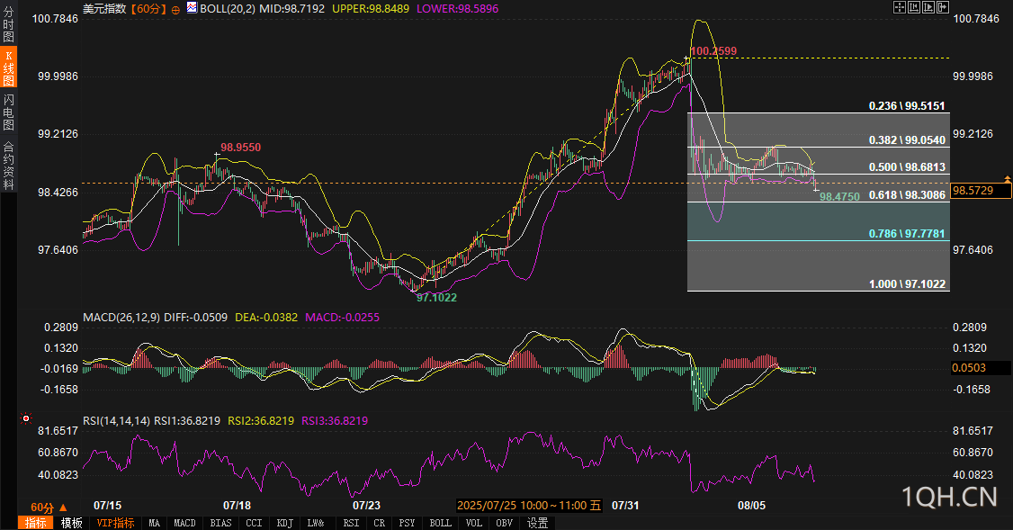 在技术层面,美元指数当前呈现明显的弱势格局。根据最新数据,美元指数在跌破61.8%斐波那契回撤位(98.3086)后,未能有效企稳,显示空头动能依然占据主导地位。相对强弱指标(RSI,周期14)目前报35.0472,已接近超卖区域,暗示短期内可能出现技术性修复行情。同时,布林带下轨已被击穿,MACD快慢线在零轴下方纠缠,表明市场动能偏空,但短期修正的可能性正在增加。
