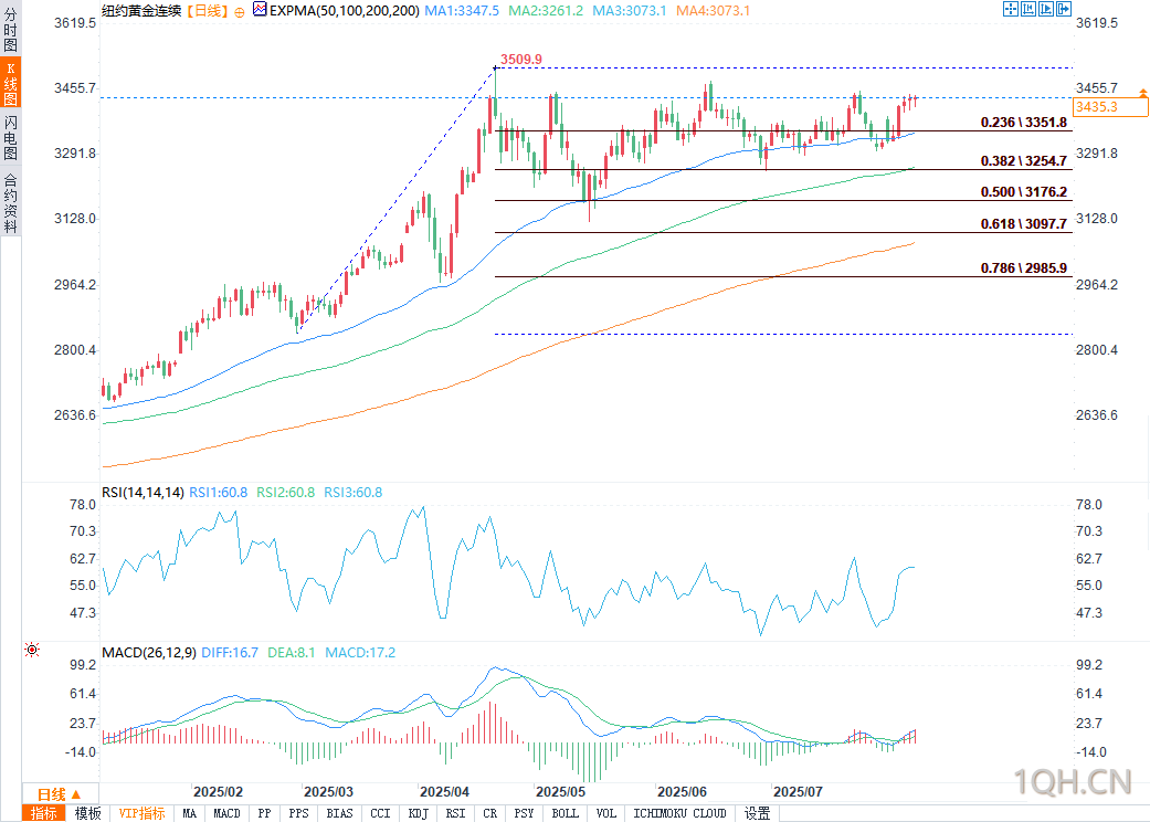 从技术面来看,12月黄金期货多头在近期整体技术面占据优势。多头的下一个上行目标是收盘价突破7月高点3509.00美元的稳固阻力位。空头的下一个近期下行目标是将期货价格推至3300.00美元的稳固技术支撑位下方。第一阻力位见于本周高点3444.90美元,其次是3450.00美元;第一支撑位见于本周低点3397.90美元,其次是3350.00美元。威科夫市场评级:6.5。