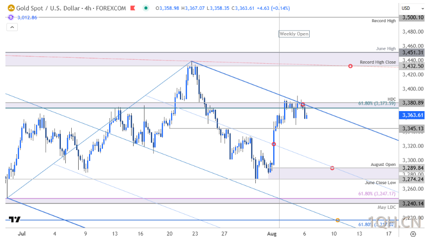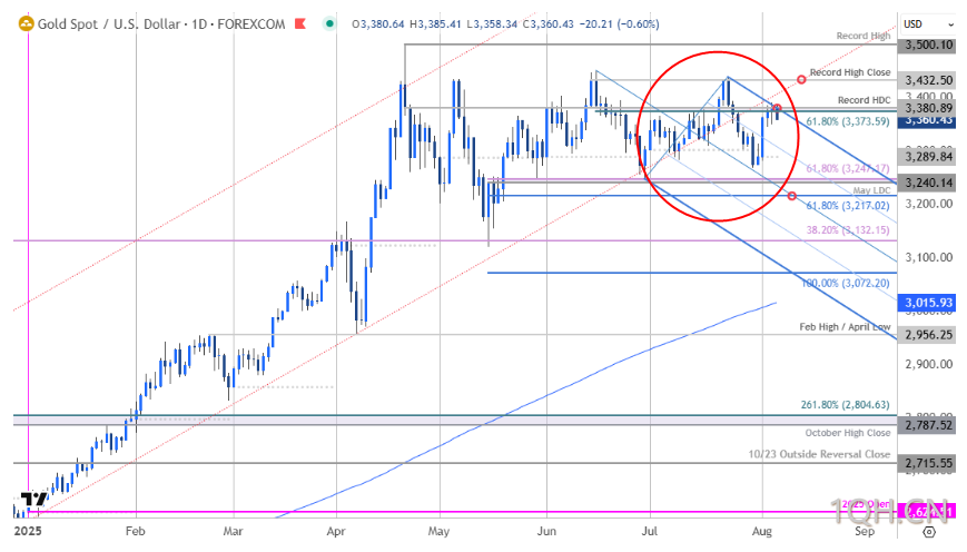 金价现况:黄金价格上个月突破了年度上升趋势,但此后大幅回调。目前正值8月初,金价正在测试关键阻力区域。这一水平在短期内至关重要,因为突破可能为再次冲击高点打开大门。以多根周线和月线的波动价格形成的整理区间正在目前黄金价格的下方演绎。黄金兑美元短期技术图表上的多空分界线已经很明确即这个区域。