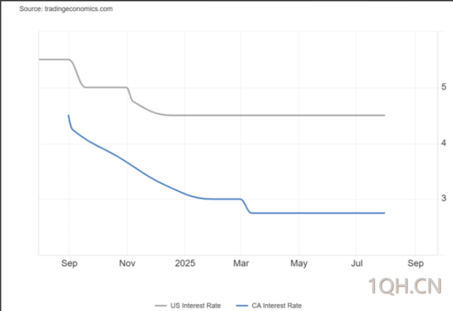 目前,美联储和加拿大央行的基准利率分别维持在4.5%和2.75%。然而,它们的利率曲线走势有望越来越分化。