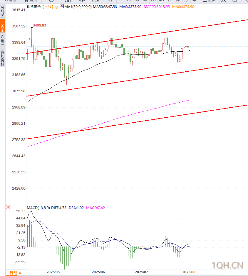 4小时图则更具积极信号:本周金价成功从200周期均线反弹,若价格突破3400美元,将确认短期上涨趋势延续,目标位依次指向3420-3422美元区间,强阻力区域则位于前高3434-3435美元附近。一旦突破,或将向历史高点3500美元迈进。