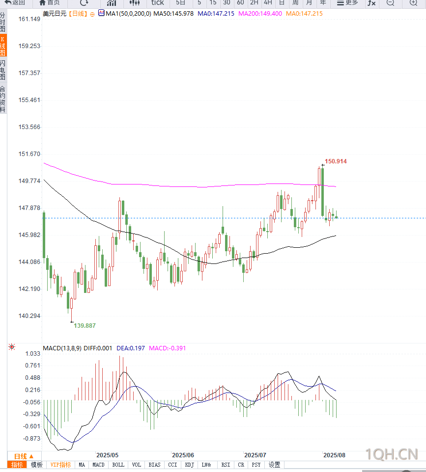 CME FedWatch工具数据显示,当前市场对9月降息的概率已超过90%。美债收益率下行及美元指数承压,均限制了美元/日元的上涨空间。