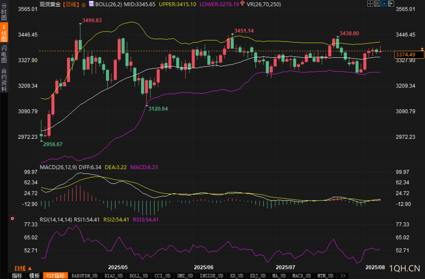 从日线图观察,黄金价格自低点2956.67美元反弹后维持震荡盘整结构,目前重返布林带中轨上方(3345.65美元),并逼近布林带上轨(3415.10美元)。