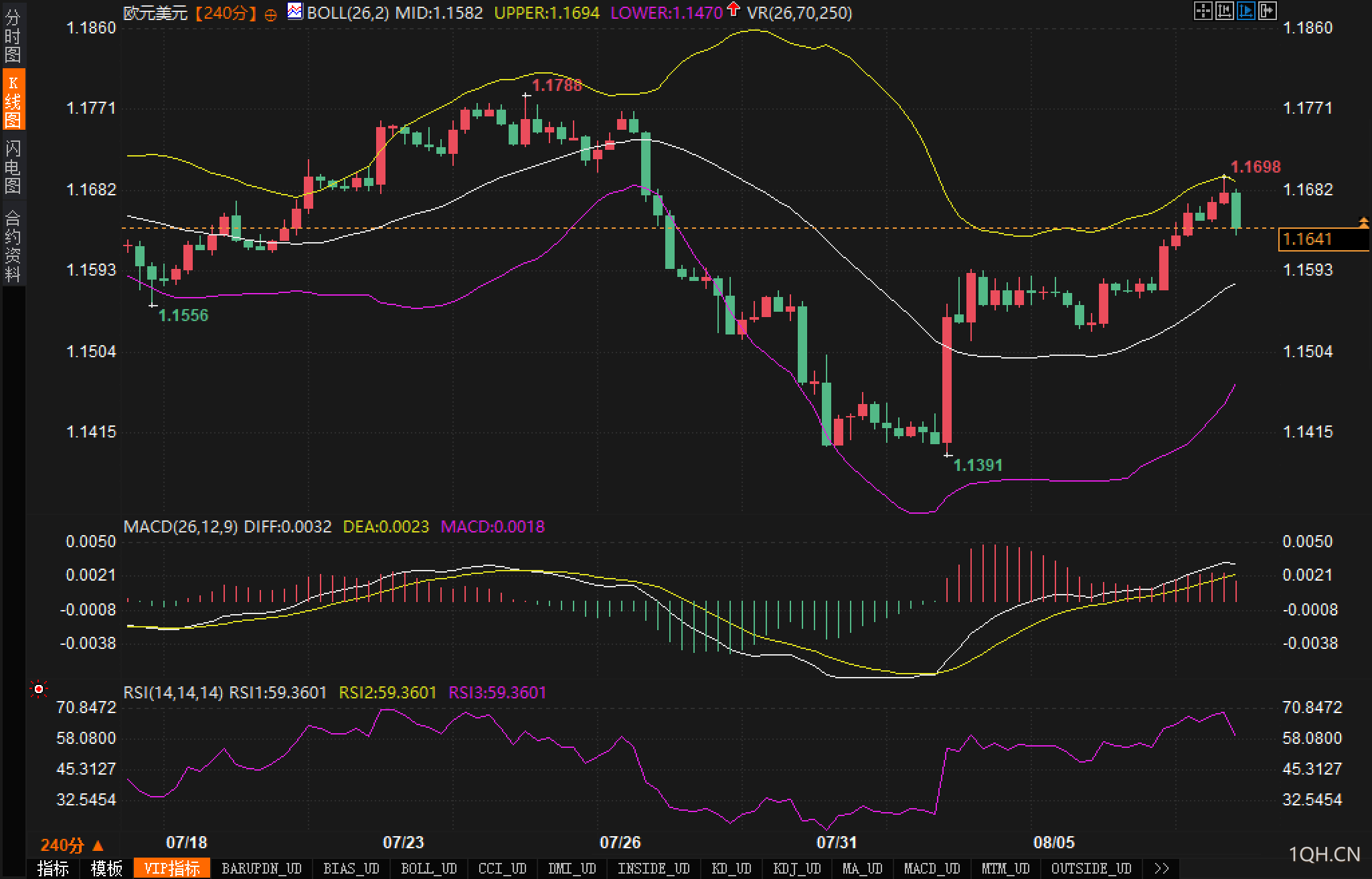 短期内,布林中轨1.1582形成首要支撑,若回撤不破此位,则多头趋势不改,当前价格走势结构偏强。MACD指标上,快慢线持续运行于零轴上方,红柱略有缩短但尚未构成顶背离,趋势仍偏积极。RSI指标位于59.36,处于中高位区域,尚未进入超买区,仍有上行空间。