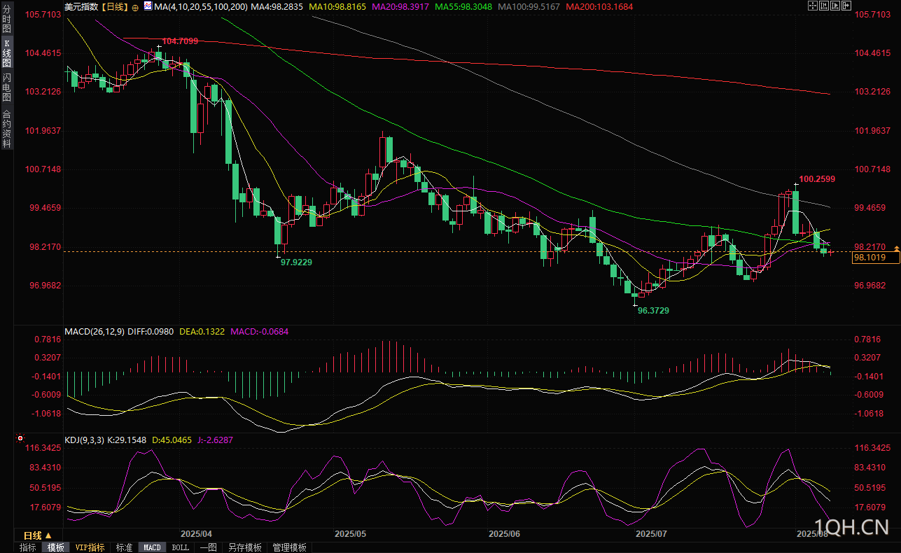 美元指数在本周的下跌,反映了市场对美国经济动能的担忧,尤其是劳动力市场的疲软表现。美元指数周五早盘报98.04,较前一周下降约0.7%。市场对美联储降息的预期持续升温,根据CME集团的FedWatch工具,交易员认为9月降息的可能性高达93%,并且预计到年底前美联储至少会降息两次,总计降幅可能达到100个基点。