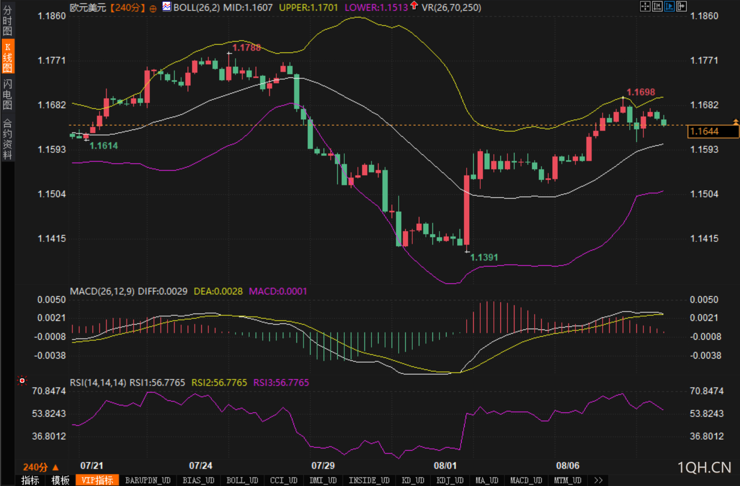 四小时图(240分K)与指标共振显示:布林带温和张口,上下轨分别位于1.1701/1.1513,中轨1.1607。价格自1.1698高点回落后,仍在中轨上方运行。